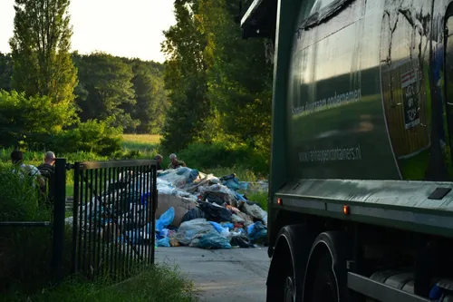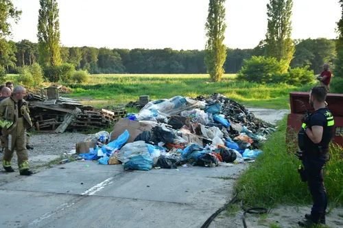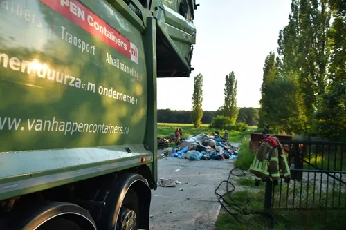 De vuilniswagen gaat ter plaatse op een terrein worden leeggekiept.